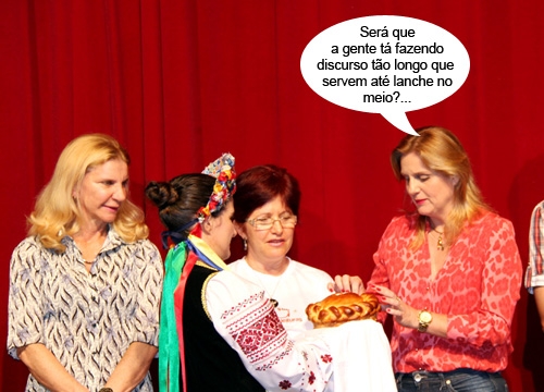 Durante a abertura da 1a Bienal do Livro de Campo Mourão, o grupo ucraniano Stchastia entregou um pão e sal para degustação. Olha aí a prefeita Regina Dubay se servindo. Segundo o padre Moacir Lecsuq, da Igreja Ucraniana, o pão representa o trabalho e o sal dá o gosto ao pão e a vida. "Usamos o pão em cerimônias festivas para desejar aos visitantes tudo de bom que nós temos e queremos transmitir”, explicou. Hummmmm...
